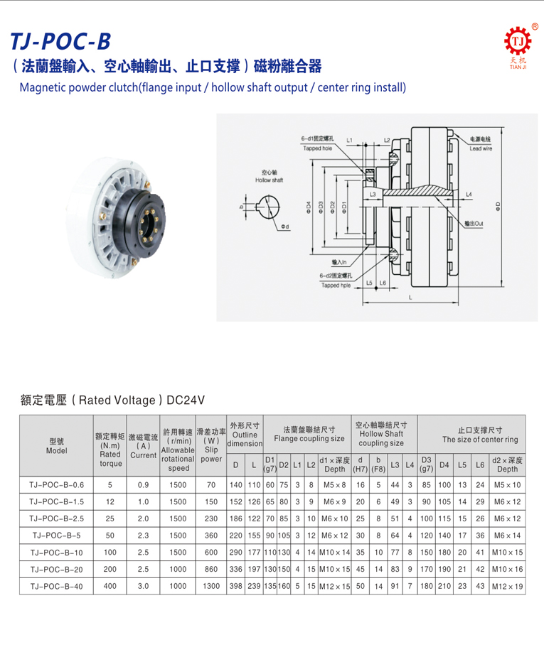 空心軸磁粉離合器(內(nèi)殼旋轉(zhuǎn)磁粉離合器)產(chǎn)品說明:TJ-POC-B磁粉離合器的工作原理與TJ-POC磁粉離合器系列的工作原理是一樣的。TJ-POC-B系列空心軸輸出磁粉離合器采用圈靜止,雖然采用的是自然冷卻方式,由于在輸入旋轉(zhuǎn)端的外周部配置了散熱片及動作面,自然冷卻效果好優(yōu)越性。它以磁粉為工作介質(zhì),以激磁電流為控制手段,達到控制制動或傳遞轉(zhuǎn)鉅的目的。其輸出轉(zhuǎn)鉅與激磁電流呈良好的線性關系而與轉(zhuǎn)速或滑差無關,并具有響應速度快結構簡單等優(yōu)點。