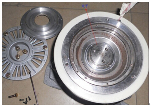 2、 然后用準(zhǔn)備好的工具將磁粉制動器端蓋的固定螺栓以及定子固定螺栓擰開,將端蓋取出后,再將擋蓋的幾個固定螺栓擰開并取下?lián)跎w,然后再取出定子。取出定子后,看到就是轉(zhuǎn)子,里面放置就是磁粉(微顆粒狀)。