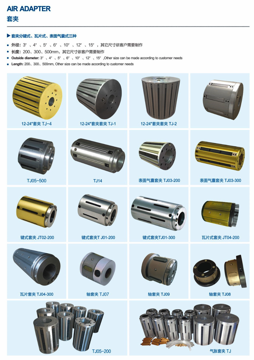 鋁合金板條式氣脹套夾,鋼制瓦片式氣脹套夾適用于涂布、分切、印刷、復(fù)卷、復(fù)合、造紙、塑料等相關(guān)機(jī)械的收放卷軸,適用于其它機(jī)械設(shè)備的有:涂布機(jī)、皮革機(jī)、定型機(jī)、壓花機(jī)、分條機(jī)、模切機(jī)、復(fù)卷機(jī)、復(fù)卷機(jī)、紙筒機(jī)、貼合機(jī)、覆膜機(jī)、吹膜機(jī)、發(fā)泡機(jī)、淋膜機(jī)、壓紋機(jī)、造紙機(jī)、無(wú)紡布機(jī)、驗(yàn)布機(jī)、燙金機(jī)、電池設(shè)備等相關(guān)機(jī)械配套之使用。